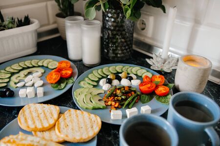Beautiful breakfast for two at home. Home comfort and proper healthy food.