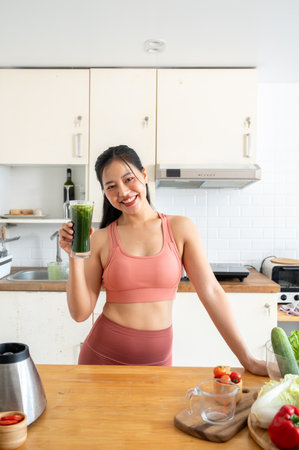 A beautiful, slim, fit Asian woman in pink sportswear is showing her glass of healthy green juice in the kitchen, making a green smoothie after workout at home. healthy food, wellness living