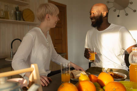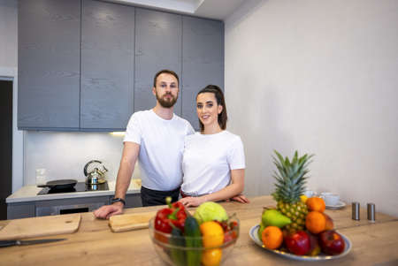 Beautiful young sports people are talking and smiling while cooking healthy food in kitchen at home