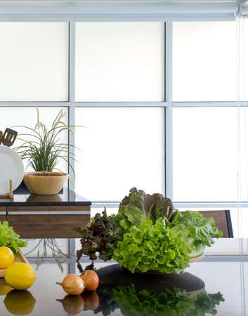 A bowl of fresh vegetables place on black shiny granite kitchen countertop. Morning atmosphere in a modern kitchen