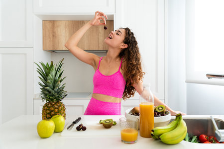 Beautiful young woman with sportswear doing healthy breakfast with fruits at home - Pretty sporty female adult having healthy nutrition lifestyle