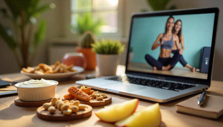 Online fitness class with healthy snacks on wooden table