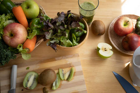 Fresh vegetables and smoothie arranged on wooden kitchen counter,.