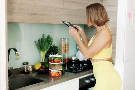 A slender blogger girl takes a photo of vegetables on her phone in the kitchen. A young woman takes a photo for her blog. The concept of a healthy diet and a healthy lifestyle.