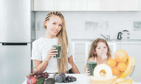 Daughter and her happy mother drinks green smoothie. Vegan meal and detox menu. Mother and daughter drinking green smoothie in kitchen. Organic food and vitamin for family.