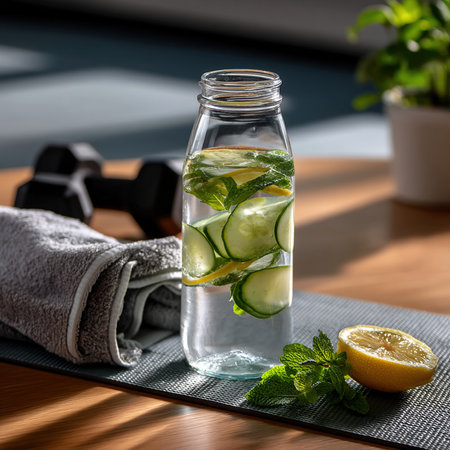 A refreshing bottle of infused water with cucumber, lemon, and mint sits on yoga mat, accompanied by towel and dumbbells, suggesting healthy lifestyle