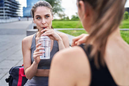 Women in training clothes sitting and drinking an isotonic drink