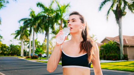 Tired athletic woman drinking water after summer workout outdoors. Beautiful girl running along alley of palm trees. Pretty young woman running with water bottle. Sports jogging concept.