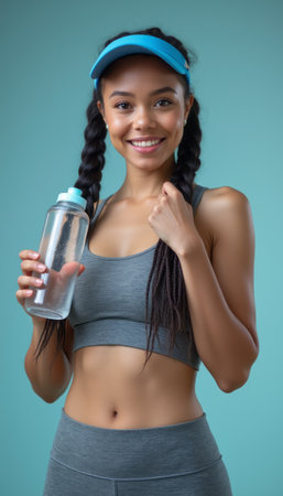 A cheerful young woman with long braids holds a clear water bottle, radiating positivity against a vibrant turquoise background. Her athletic outfit and bright visor reflect a commitment to fitness and a healthy lifestyle.