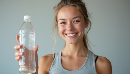 A cheerful young woman with long, flowing hair beams as she holds up a clear water bottle, radiating health and vitality. Her bright smile and athletic attire convey a message of wellness and hydration, inspiring viewers to embrace a healthy lifestyle.