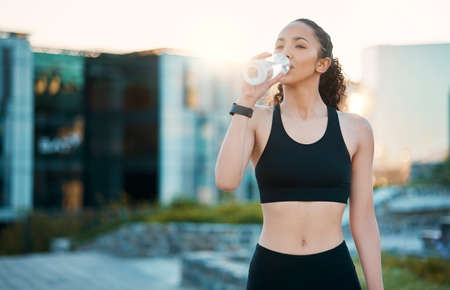Stopping for some refreshment. Cropped shot of an attractive young female athlete drinking water while out for a run in the city.