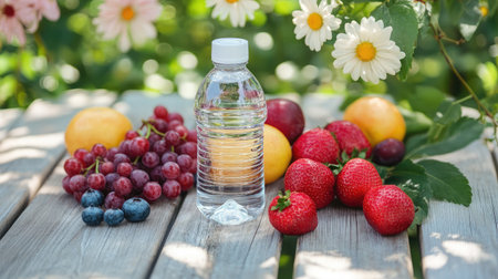 A vibrant composition featuring a water bottle surrounded by a variety of summer fruits, including grapes, strawberries, and citrus, set on a wooden table with blooming flowers, ideal for wellness themes.