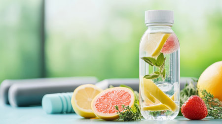 Fruit-infused water sits at the bottom while a large empty space fills the background, creating a clean wellness scene.