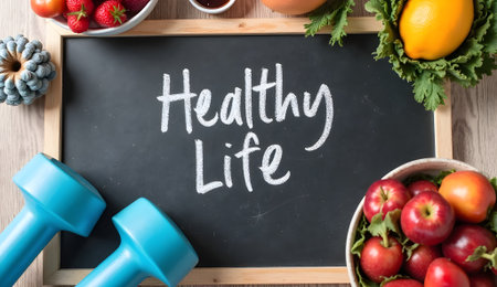 Wellness setup with Healthy Life on chalkboard and fitness gear and fruit