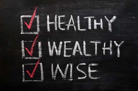Being healthy, wealthy and wise with check boxes written in chalk on a blackboard