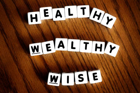 Healthy wealthy and wise words spelled with letters dice as motivation for improving and succeeding