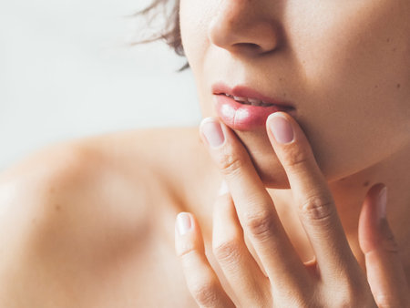 Extreme close-up of sensual young woman with plump lips, blurred background