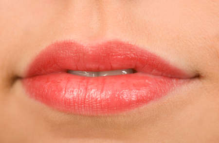 female lips with peach color lipstick on open mouth with white teeth closeup
