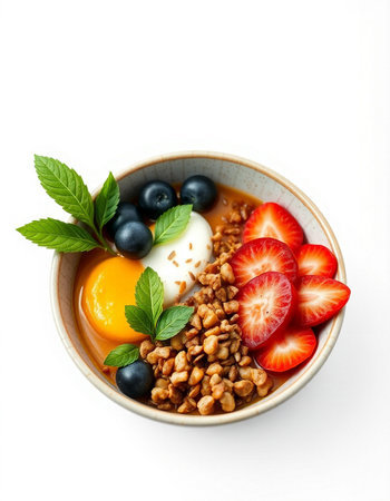 Healthy breakfast bowl with yogurt, fresh berries and nuts on white background