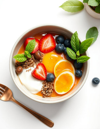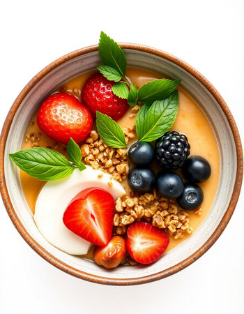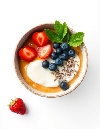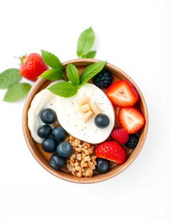bowl of yogurt with berries and mint on white background, top view