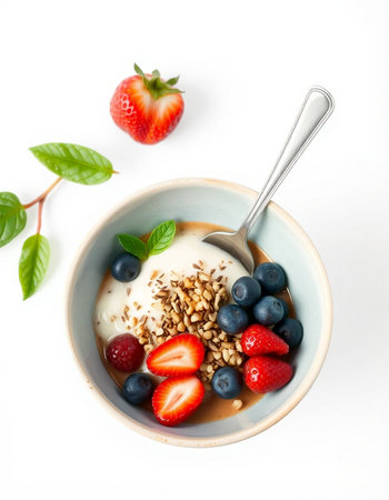 Healthy breakfast bowl with yogurt, berries on white background