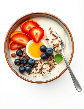 Healthy breakfast bowl with yogurt, berries and egg on white background