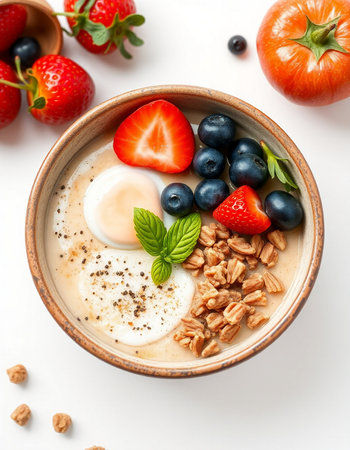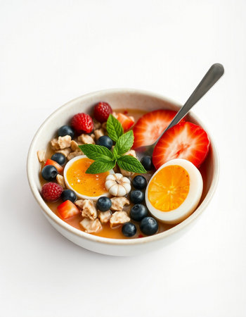 bowl of oatmeal with fresh berries and egg on white background, healthy breakfast