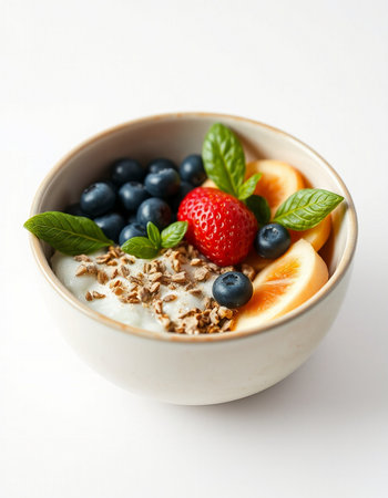 bowl of oatmeal with fruits and yogurt, isolated on white background