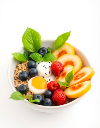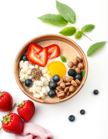 Healthy breakfast bowl with fresh berries and eggs on white background