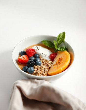 Healthy breakfast with berries in a bowl on white background