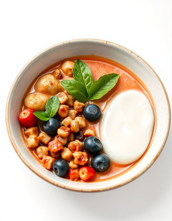 Tomato soup with chickpeas, blueberries and sour cream