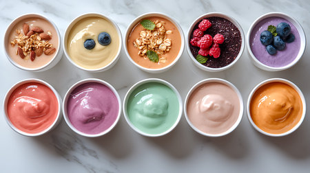 Vibrant ice cream cups filled with pastel and bold flavors, topped with fresh berries and crunchy chocolate chips, arranged on a sleek dark backdrop.