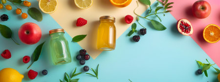 A colorful top view of various fruits and juice jars on a pastel background, showcasing a vibrant and healthy assortment perfect for fresh and nutritious drinks.