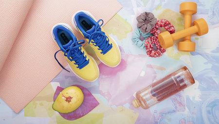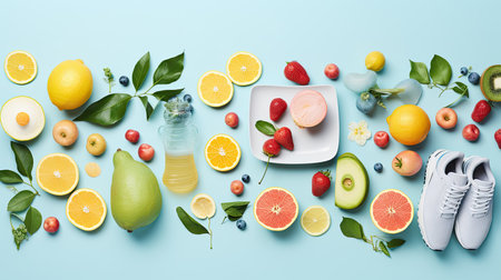 An attractive summer fitness flatley in a modern style with bright, sun-soaked colors. Fitness accessories such as dumbbells, yoga mat and refreshing water bottle. Blank space to add motivational quotes or fitness tips.