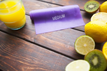 Healthy Breakfast, Sport, Fitness, Diet Concept. Citrus fruit , a glass of juice and a rubber yoga mat on a dark wooden table, close up, top view