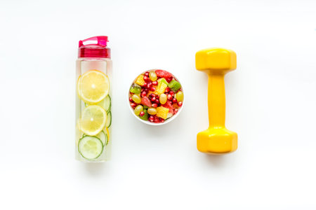 Healthy lifestyle, healthy habits. Detox water, fruit salad, sport equipment dumbbells on white background top view