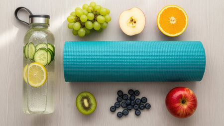 A top-down composition showcases a yoga mat accompanied by a water bottle and an assortment of fresh fruits. The image features a bright, clean aesthetic with an emphasis on healthy living. Ideal for illustrating themes of wellness, nutrition, and exercise, the visual style supports diverse commercial applications.