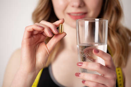 Portrait of smiling young woman with Omega 3 fish oil capsule