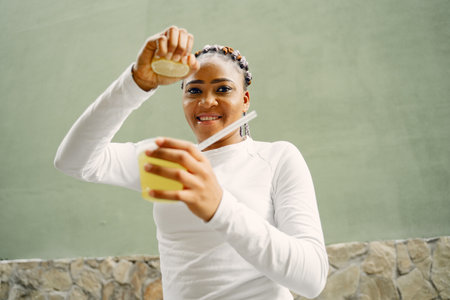 A beautiful, smiling Black woman in sportswear sits on the floor in a sunlit room, eating a healthy meal from a bowl after exercising at home. Wellness and self-care concept.