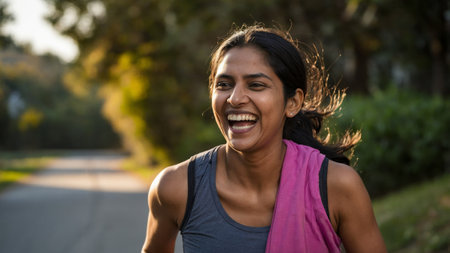 Joyful woman running along a sunlit path in the early evening, showcasing enthusiasm for fitness and outdoor activity