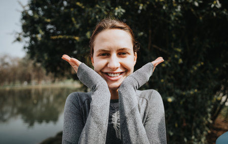 Smiling young woman enjoying outdoors against green background. generated by ai
