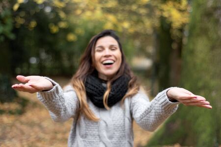 Young playful Woman Enjoying Nature At Autumn park.