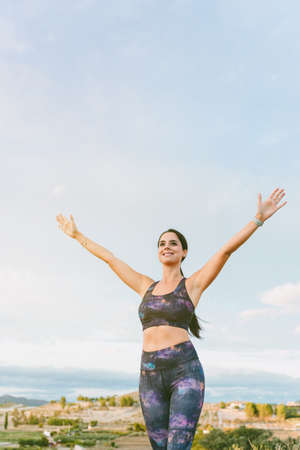 Young happy fitness woman finish outdoor workout in the city
