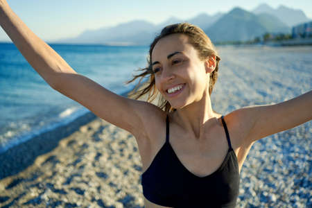 Outdoor summer portrait happy laughing american girl with open arms enjoying feeling good at sea beach
