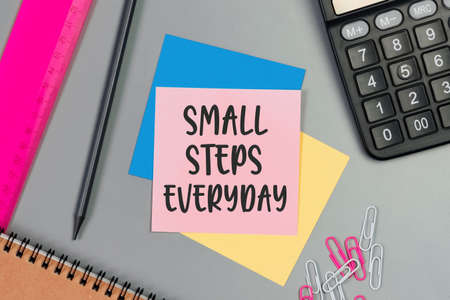 The words Small steps everyday written on a sticky note paper. Closeup of a personal agenda. Top view. Conceptual photo