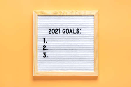 felt board with text - 2021 goals isolated on yellow background Planning, self motivation, achievement, success, wish list, checklist concept Top view Flat lay Motivational quote, message.