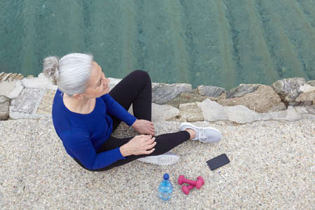 Mature woman sitting outdoors, hand weights, water and smartphone beside her, elevated view