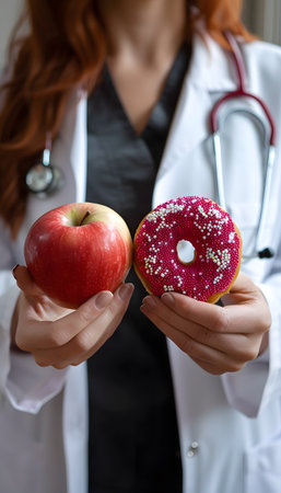 Doctor comparing apple fruit with donut staple food in hands
