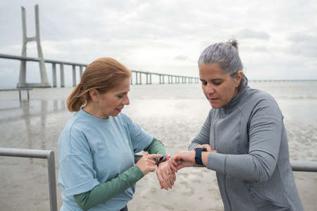 Concentrated senior friends checking pulse after training. Women in sportive clothes looking at wristwatch on embankment on cloudy day. Sport, friendship concept