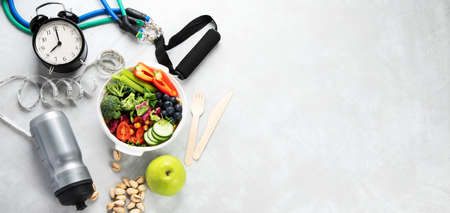 Healthy food and exercising equipment. Concept of healthy lifestyle. Flat lay, top view, copy space, panorama